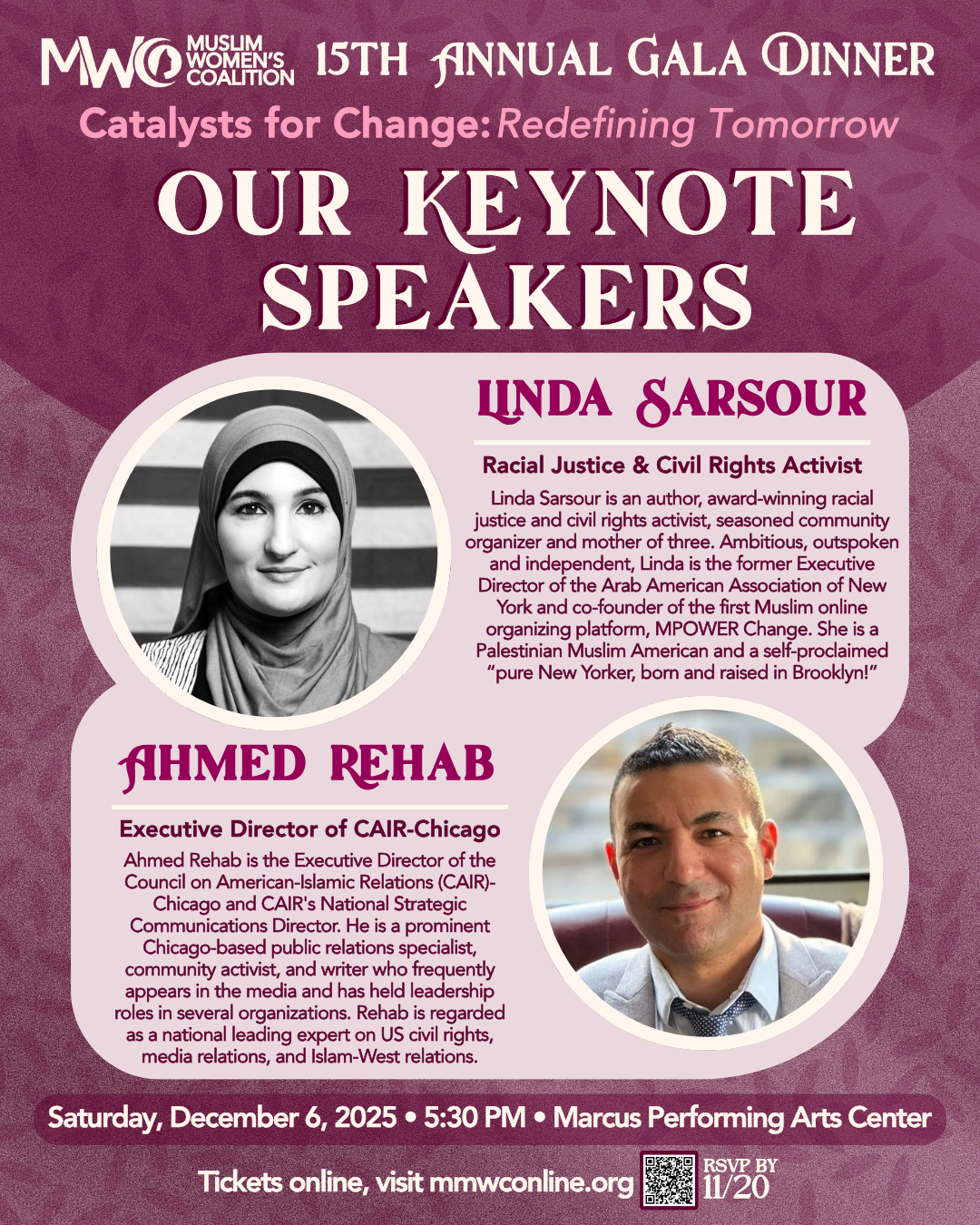 Hear from Ahmed Rehab, Executive Director of CAIR-Chicago, as a keynote speaker at the Muslim Women’s Coalition 15th Annual Gala Dinner on Saturday, December 6 at 5:30 PM at the Marcus Performing Arts Center in Milwaukee, WI.